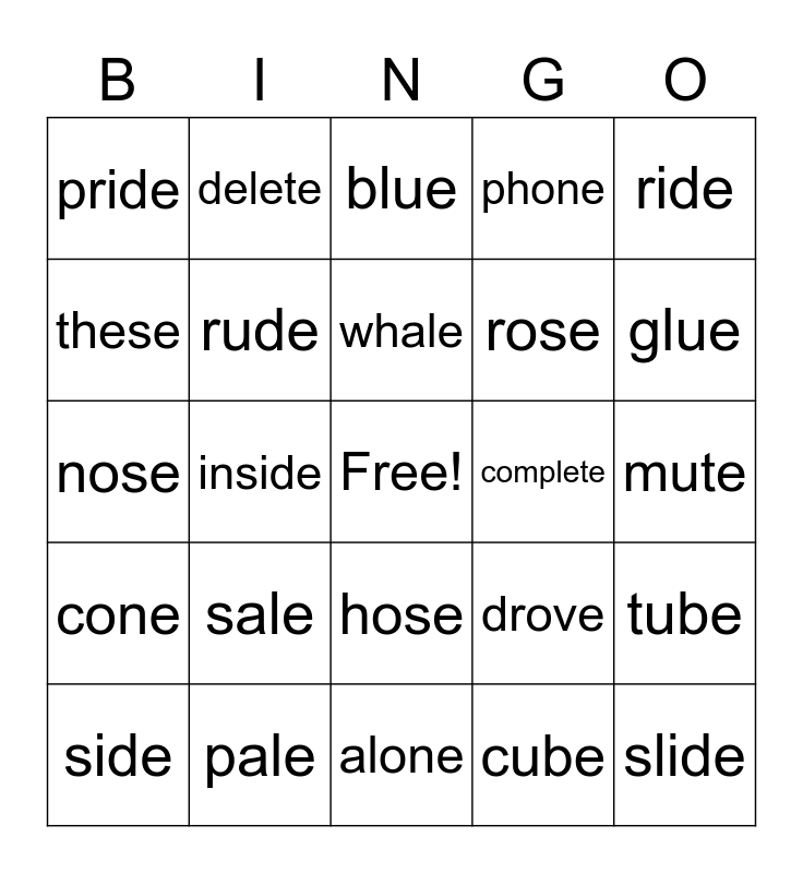 This bingo card has a free space and 24 words: sale, pale, whale, side, ride, pride, these, delete, complete, hose, rose, nose, drove, tube, rude, cube, mute, blue, glue, inside, slide, cone, phone and alone.