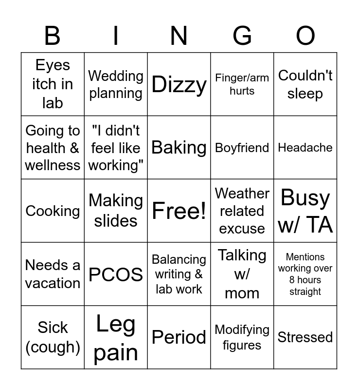 This bingo card has a free space and 24 words: PCOS, Leg pain, Baking, Sick (cough), Couldn't sleep, Eyes itch in lab, Going to health & wellness, Wedding planning, Weather related excuse, Balancing writing & lab work, Boyfriend, Cooking, Talking w/ mom, Mentions working over 8 hours straight, "I didn't feel like working", Modifying figures, Busy w/ TA, Dizzy, Headache, Making slides, Stressed, Needs a vacation, Finger/arm hurts and Period.