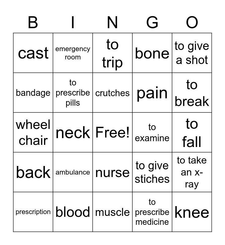This bingo card has a free space and 24 words: ambulance, blood, crutches, prescription, to give a shot, cast, bandage, emergency room, to examine, nurse, pain, wheel chair, to give stiches, to take an x-ray, to prescribe pills, to prescribe medicine, to fall, to trip, to break, neck, knee, back, bone and muscle.