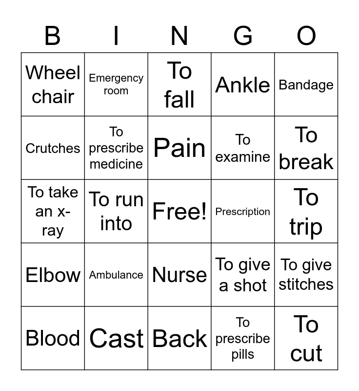 This bingo card has a free space and 24 words: Ambulance, Cast, Pain, Blood, Bandage, Wheel chair, Crutches, Emergency room, Prescription, Nurse, To examine, To take an x-ray, To give a shot, To give stitches, To prescribe medicine, To prescribe pills, To trip, To fall, To break, To run into, To cut, Elbow, Ankle and Back.