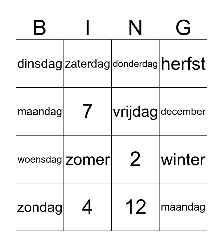 This bingo card has a free space and 15 words: zondag, maandag, donderdag, dinsdag, december, maandag, zomer, 12, 7, woensdag, winter, herfst, vrijdag, zaterdag and 4.