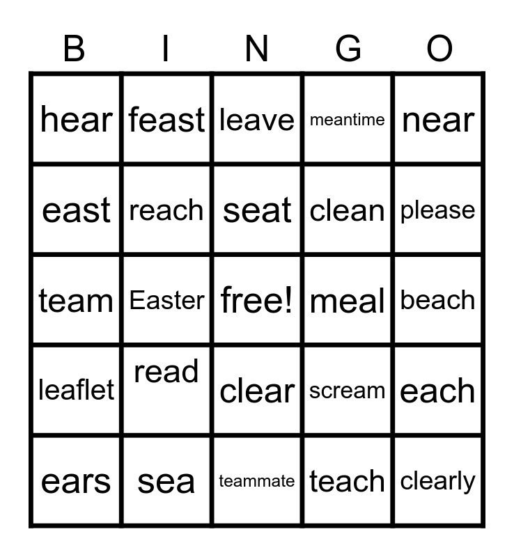 This bingo card has a free space and 24 words: read, sea, seat, ears, near, hear, east, feast, meal, clear, clean, team, scream, each, reach, teach, beach, leave, please, Easter, clearly, leaflet, meantime and teammate.