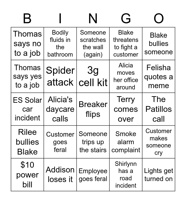 This bingo card has 25 words: Customer goes feral, Employee goes feral, 3g cell kit, $10 power bill, Blake bullies someone, Thomas says no to a job, Thomas says yes to a job, Bodily fluids in the bathroom, Terry comes over, Someone trips up the stairs, Alicia moves her office around, ES Solar car incident, Smoke alarm complaint, Customer makes someone cry, Spider attack, Lights get turned on, The Patillos call, Someone scratches the wall (again), Felisha quotes a meme, Alicia's daycare calls, Breaker flips, Addison loses it, Rilee bullies Blake, Blake threatens to fight a customer and Shirlynn has a road incident.