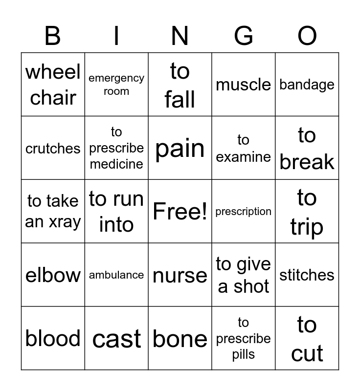 This bingo card has a free space and 24 words: ambulance, cast, pain, blood, bandage, wheel chair, crutches, emergency room, prescription, nurse, to examine, to take an xray, to give a shot, stitches, to prescribe medicine, to prescribe pills, to trip, to fall, to break, to run into, to cut, elbow, muscle and bone.