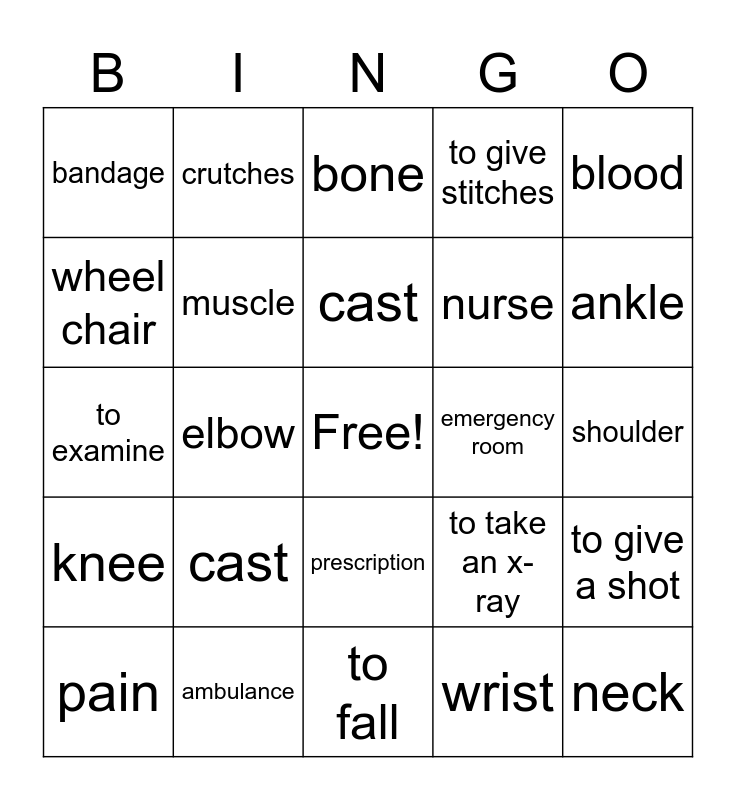 This bingo card has a free space and 24 words: cast, ambulance, cast, pain, blood, bandage, wheel chair, crutches, emergency room, prescription, nurse, to examine, to take an x-ray, to give a shot, muscle, wrist, shoulder, bone, ankle, elbow, neck, knee, to give stitches and to fall.