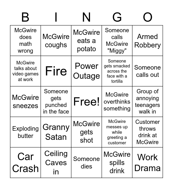 This bingo card has a free space and 24 words: Granny Satan, Ceiling Caves in, Power Outage, Car Crash, Armed Robbery, McGwire does math wrong, McGwire talks about video games at work, McGwire coughs, McGwire overthinks something, McGwire gets shot, Someone gets smacked across the face with a tortilla, McGwire sneezes, McGwire messes up while greeting a customer, Customer throws drink at McGwire, Fire, McGwire spills drink, Group of annoying teenagers walk in, McGwire eats a potato, Someone calls out, Someone gets punched in the face, Work Drama, Exploding butter, Someone calls McGwire "Miggy" and Someone dies.