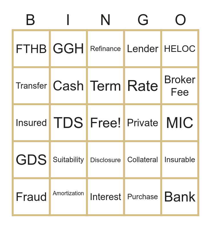 This bingo card has a free space and 39 words: ARM, FIXED, Variable, Cash, Fraud, Disclosure, Term, Mortgage, HELOC, GDS, TDS, Lender, Bank, MIC, Private, Suitability, BOSS, FTHB, ALT A, Collateral, Transfer, Interest, Rate, Broker Fee, RFA, CMLS, AVEO, Simplinsur, Firstnational, GGH, LOD, Application, Refinance, Amortization, Purchase, BPS, Insurable, Insured and ETO.