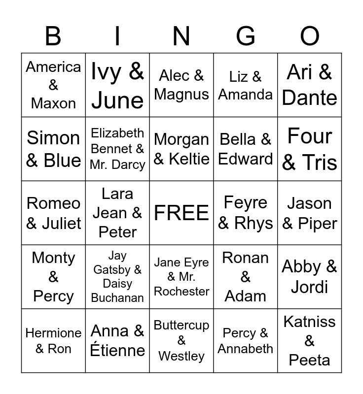This bingo card has a free space and 29 words: Hermione & Ron, Clary & Jace, Lara Jean & Peter, Kitty & Levin, America & Maxon, Alec & Magnus, Elizabeth Bennet & Mr. Darcy, Jay Gatsby & Daisy Buchanan, Feyre & Rhys, Anna & Étienne, Jason & Piper, Katniss & Peeta, Buttercup & Westley, Percy & Annabeth, Four & Tris, Eleanor & Park, Jane Eyre & Mr. Rochester, Monty & Percy, Ari & Dante, Romeo & Juliet, Ronan & Adam, Hazel & Gus, Bella & Edward, Simon & Blue, Liz & Amanda, Ivy & June, Abby & Jordi, Morgan & Keltie and Nishat & Flávia.