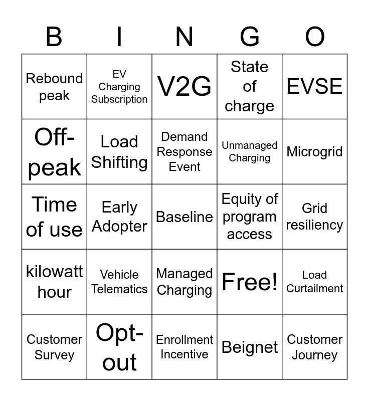 This bingo card has 25 words: Vehicle Telematics, Enrollment Incentive, Demand Response Event, Customer Survey, EVSE, Rebound peak, Off-peak, EV Charging Subscription, Equity of program access, Managed Charging, Unmanaged Charging, Time of use, Free!, Load Curtailment, Load Shifting, Customer Journey, Grid resiliency, V2G, Microgrid, Early Adopter, Baseline, Opt-out, kilowatt hour, State of charge and Beignet.