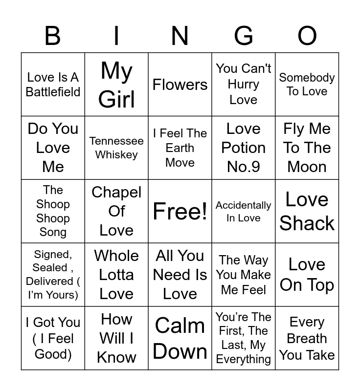This bingo card has a free space and 66 words: Is This Love, L-O-V-E, Youre The One That I Want, Love On Top, Love Story, Adore You, My Girl, 10,000 Hours ( With Justin Bieber), I Feel The Earth Move, Your Love, All You Need Is Love, That’s Amore, Love Shack, Somebody To Love, The Power Of Love, Do You Love Me, Chapel Of Love, Love Is A Battlefield, Stop! In The Name Of Love, Love Potion No.9, Whole Lotta Love, Signed, Sealed , Delivered ( I’m Yours), You Can't Hurry Love, Don’t Go Breaking My Heart, Sucker, Can’t Feel My Face, Wouldn’t It Be Nice, This Will Be ( An Everlasting Love), Every Breath You Take, Baby Love, I Got You ( I Feel Good), What Is Love, Lean On Me, Escape ( The Pina Colada Song), The Way You Make Me Feel, How Will I Know, Last Dance, The Shoop Shoop Song, You’re The First, The Last, My Everything, Mustang Sally, Tennessee Whiskey, You Proof, Accidentally In Love, Ain't No Mountain High Enough, You Give Love A Bad Name, Fallin’, Fly Me To The Moon, Be My Baby, I really Like You, Love Grows, You Are The Best Thing, Love Will Keep Us Together, Until I Found You, Bennie And The Jets, Burning Love, Kiss From A Rose, Count on Me, You’ve Got A Friend In Me, Flowers, Calm Down, Someone Like YOu, WHats Love Got To Do With It, ( I’ve Had) The Time Of My Life, I Can’t Help Myself ( Sugar Pie Honey Bunch ), Something’s Got A Hold On Me and Who’s Lovin You.