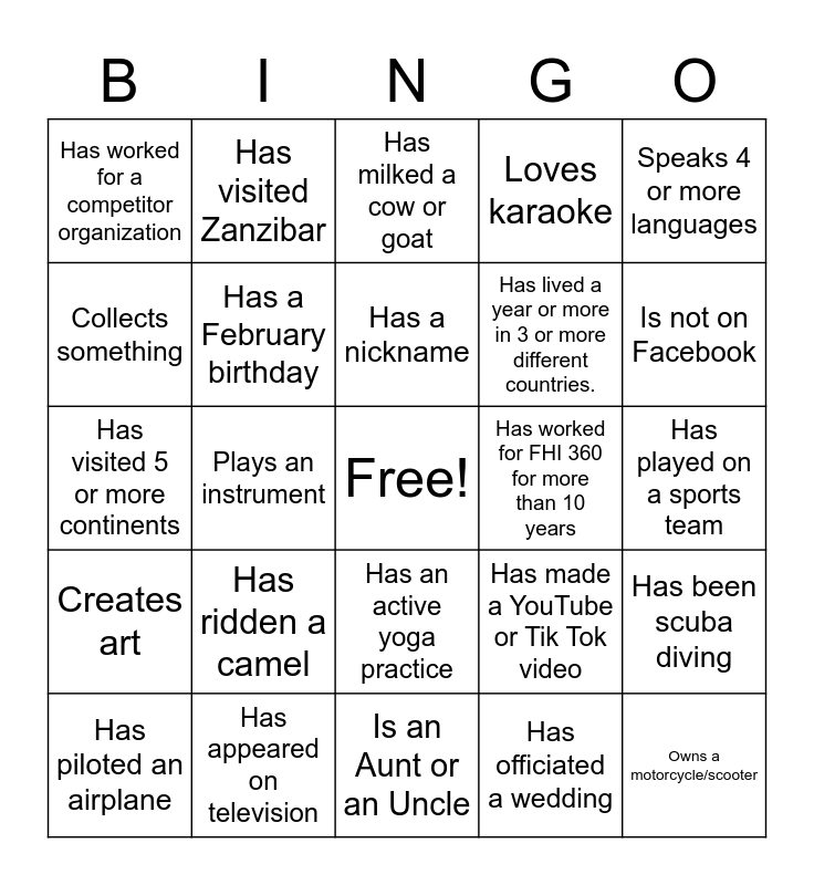 This bingo card has a free space and 35 words: Has acted in a play, Is vegetarian, Has the same birth month as you, Has a February birthday, Has an active yoga practice, Loves karaoke, Collects something, Named after a relative, Has a nickname, Worked at a family business, Has visited 5 or more continents, Speaks 4 or more languages, Has a pet, Has been in a hot air balloon, Has worked for a competitor organization, Has worked for FHI 360 for more than 10 years, Has officiated a wedding, Plays an instrument, Creates art, Owns a motorcycle/scooter, Has made a YouTube or Tik Tok video, Has piloted an airplane, Has been scuba diving, Has appeared on television, Has milked a cow or goat, Is not on Facebook, Has met someone famous, Currently lives in a country other than the one in which they were born, Has lived a year or more in 3 or more different countries., Has played on a sports team, Has cooked Jollof rice, Is an Aunt or an Uncle, Has ridden a camel, Has visited Zanzibar and Traveled by boat on the Nile.