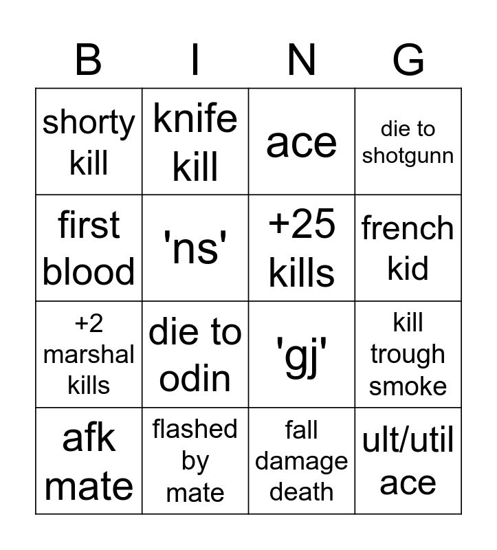 This bingo card has 16 words: flashed by mate, kill trough smoke, ace, shorty kill, +2 marshal kills, knife kill, 'gj', fall damage death, first blood, 'ns', afk mate, die to shotgunn, die to odin, french kid, +25 kills and ult/util ace.