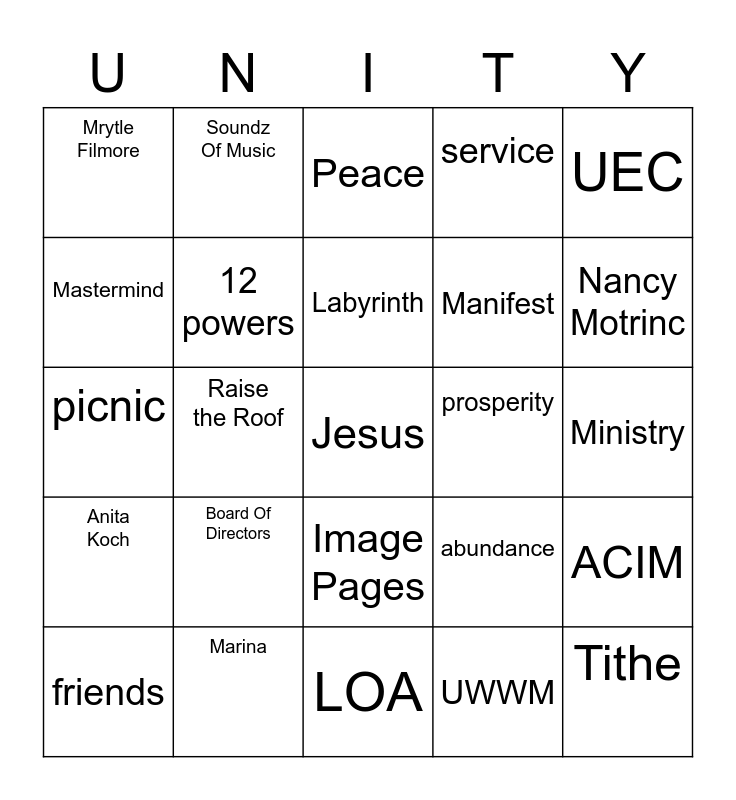 This bingo card has a free space and 55 words: Truth, friends, GOD, Mrytle Filmore, LOA, Love, 12 powers, Talents, Manifest, Church, service, Charles Filmore, Health, God Mind, One, Family, UEC, Raise the Roof, Time, Tithe, prosperity, Treasures, abundance, Peace, Lees Summit, Labyrinth, UWWM, LUT, Ministry, ACIM, Spirituality, Pot Lucks, Fundraisers, Classes, Mastermind, picnic, Ben Walker, Anita Koch, Linda Ridley, Paul Ritchie, Soundz Of Music, Bobby George, Prayer of Protection, Peace Song, Board Of Directors, Marina, Blessed, fellowship, Social Club, Nancy Motrinc, Choir, Tony Cameletti, Women of the bible, Image Pages and Unity Village.