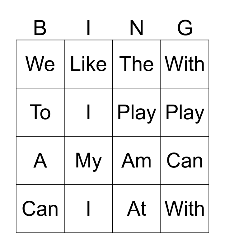This bingo card has 16 words: I, Can, The, We, A, Like, Am, At, To, I, Can, With, My, Play, Play and With.