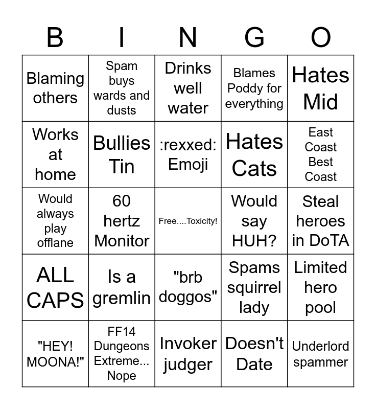 This bingo card has a free space and 24 words: Is a gremlin, FF14 Dungeons Extreme... Nope, :rexxed: Emoji, "HEY! MOONA!", Hates Mid, Blaming others, Works at home, Spam buys wards and dusts, Would say HUH?, "brb doggos", Hates Cats, Would always play offlane, Spams squirrel lady, Limited hero pool, Bullies Tin, Doesn't Date, Steal heroes in DoTA, Drinks well water, East Coast Best Coast, 60 hertz Monitor, Underlord spammer, ALL CAPS, Blames Poddy for everything and Invoker judger.
