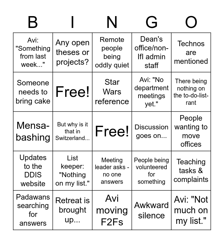 This bingo card has a free space and 25 words: List keeper: "Nothing on my list.", Avi moving F2Fs, Star Wars reference, Padawans searching for answers, Technos are mentioned, Avi: "Something from last week...", Someone needs to bring cake, Any open theses or projects?, Discussion goes on..., Meeting leader asks - no one answers, Avi: "No department meetings yet.", Mensa-bashing, People being volunteered for something, Teaching tasks & complaints, Free!, Screen issues, People wanting to move offices, Remote people being oddly quiet, There being nothing on the to-do-list-rant, But why is it that in Switzerland..., Avi: "Not much on my list.", Retreat is brought up..., Updates to the DDIS website, Dean's office/non-IfI admin staff and Awkward silence.