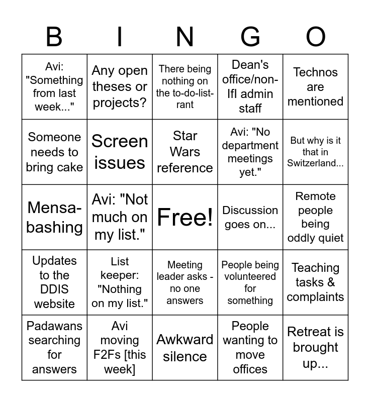 This bingo card has a free space and 24 words: List keeper: "Nothing on my list.", Avi moving F2Fs [this week], Star Wars reference, Padawans searching for answers, Technos are mentioned, Avi: "Something from last week...", Someone needs to bring cake, Any open theses or projects?, Discussion goes on..., Meeting leader asks - no one answers, Avi: "No department meetings yet.", Mensa-bashing, People being volunteered for something, Teaching tasks & complaints, Screen issues, People wanting to move offices, Remote people being oddly quiet, There being nothing on the to-do-list-rant, But why is it that in Switzerland..., Avi: "Not much on my list.", Retreat is brought up..., Updates to the DDIS website, Dean's office/non-IfI admin staff and Awkward silence.