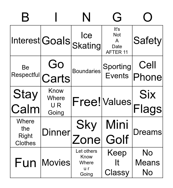 This bingo card has a free space and 24 words: Dinner, Movies, Boundaries, Fun, Safety, Interest, Be Respectful, Goals, Values, Sky Zone, Sporting Events, Stay Calm, Mini Golf, Dreams, Go Carts, Keep It Classy, Six Flags, Ice Skating, Cell Phone, Know Where U R Going, No Means No, Where the Right Clothes, It's Not A Date AFTER 11 and Let others Know Where u r Going.