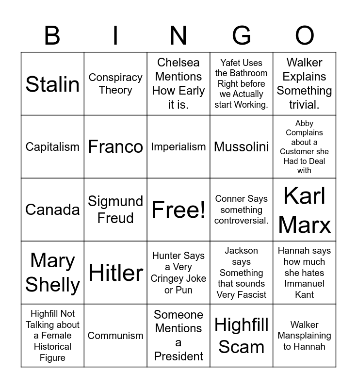This bingo card has a free space and 24 words: Hitler, Communism, Imperialism, Highfill Not Talking about a Female Historical Figure, Walker Explains Something trivial., Stalin, Capitalism, Conspiracy Theory, Conner Says something controversial., Hunter Says a Very Cringey Joke or Pun, Mussolini, Canada, Jackson says Something that sounds Very Fascist, Hannah says how much she hates Immanuel Kant, Franco, Highfill Scam, Karl Marx, Chelsea Mentions How Early it is., Abby Complains about a Customer she Had to Deal with, Sigmund Freud, Walker Mansplaining to Hannah, Mary Shelly, Yafet Uses the Bathroom Right before we Actually start Working. and Someone Mentions a President.