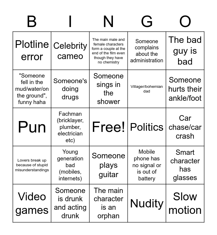 This bingo card has a free space and 24 words: Young generation bad (mobiles, internets), Someone is drunk and acting drunk, Someone sings in the shower, Video games, The bad guy is bad, Plotline error, "Someone fell in the mud/water/on the ground", funny haha, Celebrity cameo, Politics, Someone plays guitar, Villager/bohemian dad, Pun, Mobile phone has no signal or is out of battery, Smart character has glasses, Someone's doing drugs, Nudity, Car chase/car crash, The main male and female characters form a couple at the end of the film even though they have no chemistry, Someone hurts their ankle/foot, Fachman (bricklayer, plumber, electrician etc), Slow motion, Lovers break up because of stupid misunderstandings, Someone complains about the administration and The main character is an orphan.