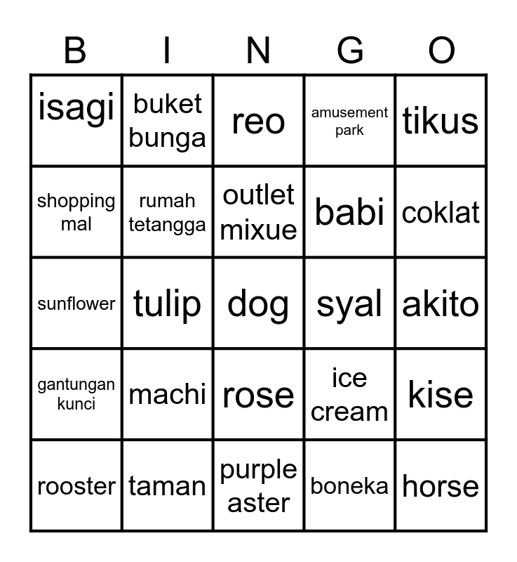This bingo card has 25 words: gantungan kunci, taman, dog, boneka, tikus, isagi, buket bunga, reo, syal, kise, shopping mal, rumah tetangga, purple aster, ice cream, coklat, rooster, tulip, outlet mixue, babi, akito, sunflower, machi, rose, amusement park and horse.