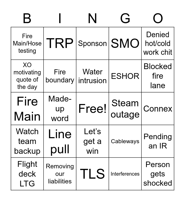 This bingo card has a free space and 71 words: PPE, TRP, ABT, FAF, TLS, JLG, SMO, CTWD, ESHOR, Void, Flight deck LTG, Nuking a problem, Blocked fire lane, Fire Main/Hose testing, Broken containment, Fire Main, Cableways, Denied hot/cold work chit, Argon, Connex, Line pull, Person gets shocked, Pending an IR, Need more granularity, Piggyback, Fire safety council, GO ON MUTE, Sell it (a space), 1MC interruption, I would challenge the team, Removing our liabilities, Working with the trades, CHENG asks late question, More to follow (MTF), Interferences, Look ahead, Stay ahead, Head on a swivel, Let’s sidebar this, XO motivating quote of the day, Name gets mispronounced, Let’s get a win, Freeze protection, Watch team backup, Big blue (48k) goes down, Safety first, People always, As reads, Fire curtain, Fire boundary, HB door testing, Person gets unavoidably mad but for no reason, Someone’s services get pulled, Chill(ed) water, Steam outage, 96 hour, Blue wire, Silica dust, Water intrusion, Heaters, Fall protection, Angry pallet person, Human waste in space, We should put a camera in there, Made-up word, Weather impact, Marine Chemist, Who has the ball?, Sponson, Emotion vs. passion, Fire drill, Gas Free and Fired off a dad joke.