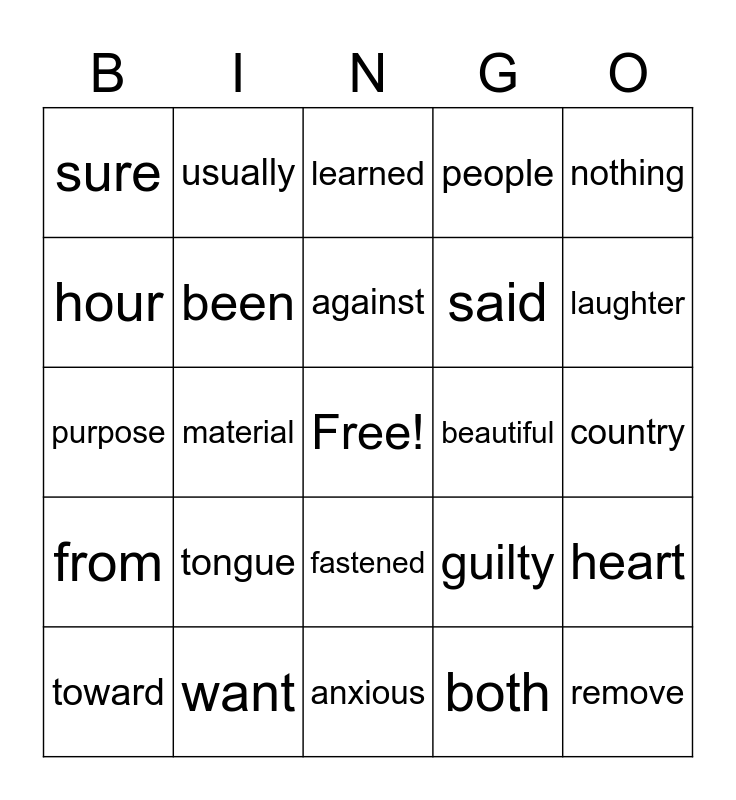 This bingo card has a free space and 60 words: does, want, they, from, both, should, been, front, said, world, people, pushed, hour, through, friend, sure, remove, nothing, once, against, beautiful, learned, toward, heart, daughter, minute, above, ocean, laughter, trouble, special, danger, knowledge, whole, usually, discover, environment, material, library, purpose, control, tongue, country, tomorrow, guilty, machinery, purchase, shoulder, guardian, fastened, anxious, worried, interior, foreign, leagues, persuade, honesty, doubt, conscious and carriage.
