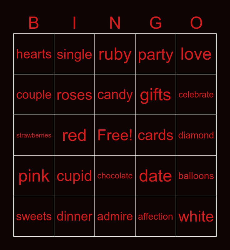 This bingo card has a free space and 24 words: cupid, dinner, candy, sweets, love, hearts, couple, single, cards, chocolate, gifts, strawberries, date, balloons, roses, affection, diamond, ruby, celebrate, red, white, pink, party and admire.