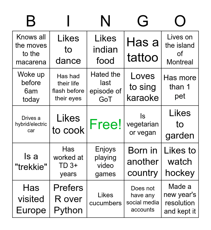 This bingo card has a free space and 24 words: Has worked at TD 3+ years, Prefers R over Python, Hated the last episode of GoT, Has visited Europe, Lives on the island of Montreal, Knows all the moves to the macarena, Woke up before 6am today, Likes to dance, Is vegetarian or vegan, Enjoys playing video games, Loves to sing karaoke, Drives a hybrid/electric car, Born in another country, Likes to watch hockey, Has had their life flash before their eyes, Does not have any social media accounts, Likes to garden, Likes indian food, Has more than 1 pet, Likes to cook, Made a new year's resolution and kept it, Is a "trekkie", Has a tattoo and Likes cucumbers.