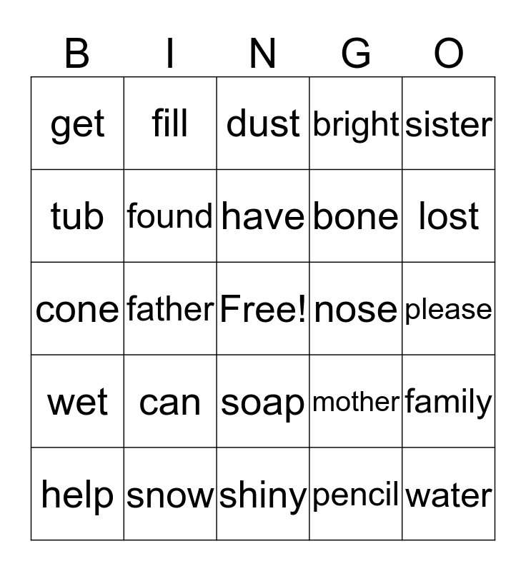 This bingo card has a free space and 24 words: can, snow, have, help, sister, get, tub, fill, nose, soap, bone, cone, mother, family, found, pencil, please, dust, lost, father, water, wet, bright and shiny.
