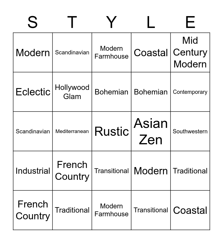 ⚠ This card has duplicate items: Minimalist (2), Scandinavian (2), Art Deco (2), Hollywood Glam (2), Traditional (2), Transitional (2), Bohemian (2), Eclectic (2), Mid Century Modern (2), Industrial (2), Mediterranean (2), Coastal (2), Rustic (2), Southwestern (2), Asian Zen (2), French Country (2), Shabby Chic (2), Modern (2), Contemporary (2), Modern Farmhouse (2)