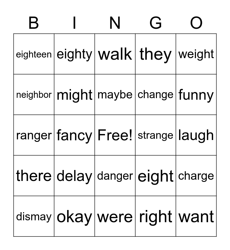 This bingo card has a free space and 24 words: delay, okay, maybe, dismay, weight, eighteen, neighbor, eighty, strange, danger, change, ranger, eight, charge, might, right, laugh, walk, funny, fancy, want, there, they and were.