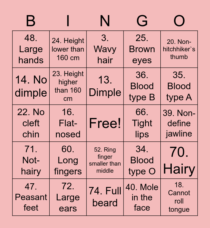 This bingo card has a free space and 76 words: 1. Straight hair, 2. Curly hair, 3. Wavy hair, 4. Natural black hair, 5. Natural brown hair, 6. Black with shade of brown hair, 7. Free earlobes, 8. Detached earlobes, 9. Freckles, 10. No freckles, 11. Widows peak, 12. No widows peak, 13. Dimple, 14. No dimple, 15. Pointed nose, 16. Flat-nosed, 17. Can roll tongue, 18. Cannot roll tongue, 19. Hitchhiker’s thumb, 20. Non-hitchhiker`s thumb, 21. Cleft chin, 22. No cleft chin, 23. Height higher than 160 cm, 24. Height lower than 160 cm, 25. Brown eyes, 26. Black eyes, 27. Gray eyes, 28. Blue eyes, 29. Fair skin, 30. Dark skin, 31. Moreno/Morena skin, 32. Round Eyes, 33. Non-round eyes/Tight eyes (singkit), 34. Blood type O, 35. Blood type A, 36. Blood type B, 37. Blood type AB, 38. Define Jawline, 39. Non-define jawline, 40. Mole in the face, 41. Mole in arms, 42. Mole in body, 43. Mole in legs, 44. Egyptian feet, 45. Greek feet, 46. Roman feet, 47. Peasant feet, 48. Large hands, 49. Small hands, 50. Broad shoulders, 51. Tiny shoulders, 52. Ring finger smaller than middle, finger, 53. Ring finger taller than middle finger, 54. Adams apple, 55. No adams apple, 56. Pinkish lips, 57. Non-pinkish lips, 58. Presence of white hair, 59. White hair, 60. Long fingers, 61. Short fingers, 62. Long Legs, 63. Short legs, 64. Long Eyelashes, 65. Short eyelashes, 66. Tight lips, 67. Round lips, 68. Proper teeth arrangement, 69. Not-proper teeth arrangement, 70. Hairy, 71. Not-hairy, 72. Large ears, 73. Small ears, 74. Full beard and 75. Half beard.