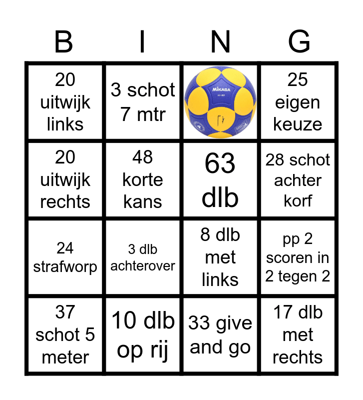 This bingo card has 1 images and 15 words: 10 dlb op rij, pp 2 scoren in 2 tegen 2, 20 uitwijk links, 24 strafworp, 3 schot 7 mtr, 8 dlb met links, 33 give and go, 20 uitwijk rechts, 48 korte kans, 37 schot 5 meter, 25 eigen keuze, 3 dlb achterover, 28 schot achter korf, 63 dlb and 17 dlb met rechts.