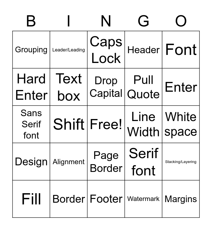 This bingo card has a free space and 24 words: Alignment, Border, Drop Capital, Fill, Font, Grouping, Hard Enter, Leader/Leading, Line Width, Page Border, Pull Quote, Sans Serif font, Serif font, Stacking/Layering, Text box, Watermark, White space, Caps Lock, Enter, Shift, Margins, Design, Header and Footer.