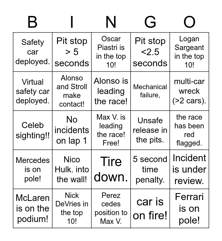 This bingo card has a free space and 24 words: Nico Hulk. into the wall!, Nick DeVries in the top 10!, Alonso is leading the race!, McLaren is on the podium!, Logan Sargeant in the top 10!, Safety car deployed., Virtual safety car deployed., Pit stop > 5 seconds, Unsafe release in the pits., Tire down., Mechanical failure,, Celeb sighting!!, 5 second time penalty., Incident is under review., Alonso and Stroll make contact!, car is on fire!, the race has been red flagged., Oscar Piastri is in the top 10!, multi-car wreck (>2 cars)., No incidents on lap 1, Ferrari is on pole!, Mercedes is on pole!, Pit stop <2.5 seconds and Perez cedes position to Max V..