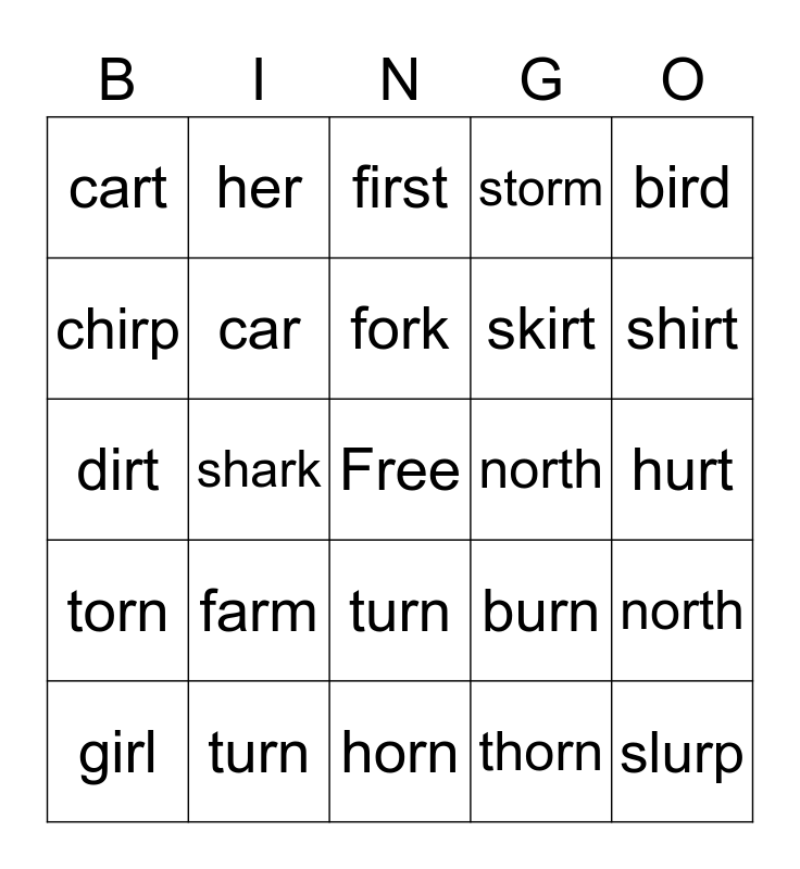 This bingo card has a free space and 24 words: farm, turn, fork, girl, bird, cart, chirp, her, north, turn, skirt, dirt, burn, north, car, thorn, hurt, first, shirt, shark, slurp, torn, storm and horn.