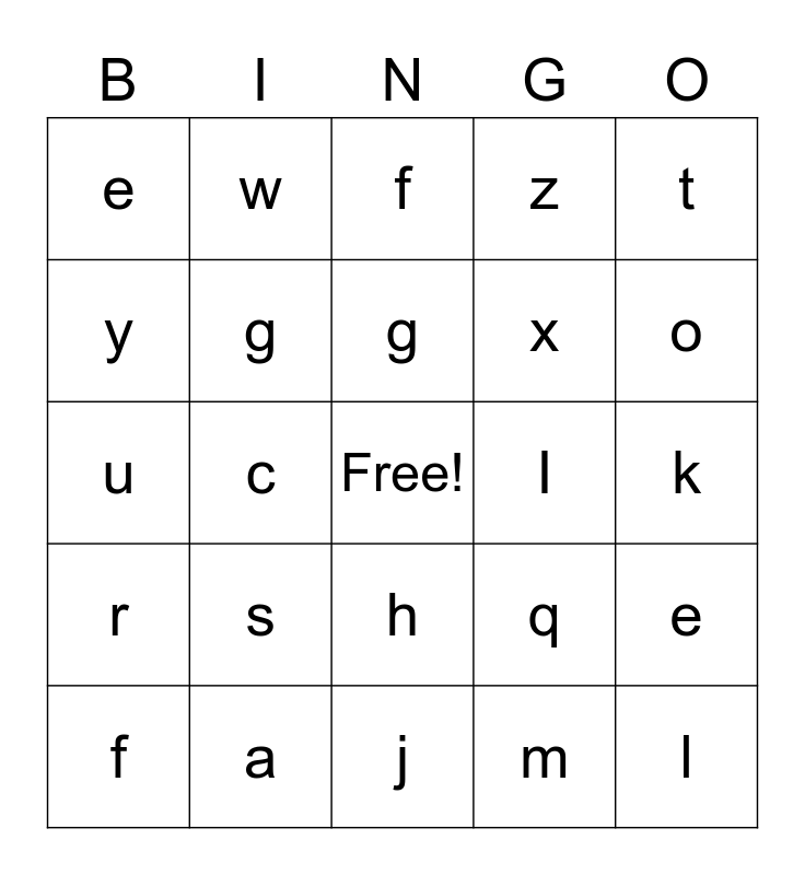 This bingo card has a free space and 30 words: a, b, c, d, e, f, g, h, I, j, k, l, m, n, o, p, q, r, s, t, u, v, w, x, y, z, e, f, g and b.
