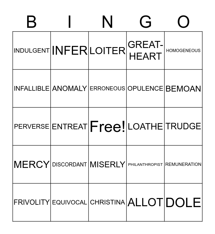 This bingo card has a free space and 24 words: DISCORDANT, EQUIVOCAL, ERRONEOUS, FRIVOLITY, HOMOGENEOUS, INDULGENT, INFALLIBLE, INFER, LOATHE, MISERLY, OPULENCE, PERVERSE, PHILANTHROPIST, REMUNERATION, ANOMALY, ALLOT, TRUDGE, LOITER, BEMOAN, ENTREAT, DOLE, MERCY, GREAT-HEART and CHRISTINA.
