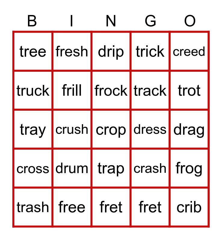 This bingo card has a free space and 24 words: drum, free, frock, trash, creed, tree, truck, fresh, dress, trap, track, tray, crash, frog, frill, fret, drag, drip, trot, crush, crib, cross, trick and fret.