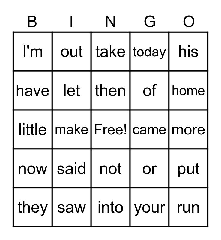 This bingo card has a free space and 24 words: said, saw, then, they, his, I'm, have, out, came, not, of, little, or, put, let, your, more, take, home, make, run, now, today and into.