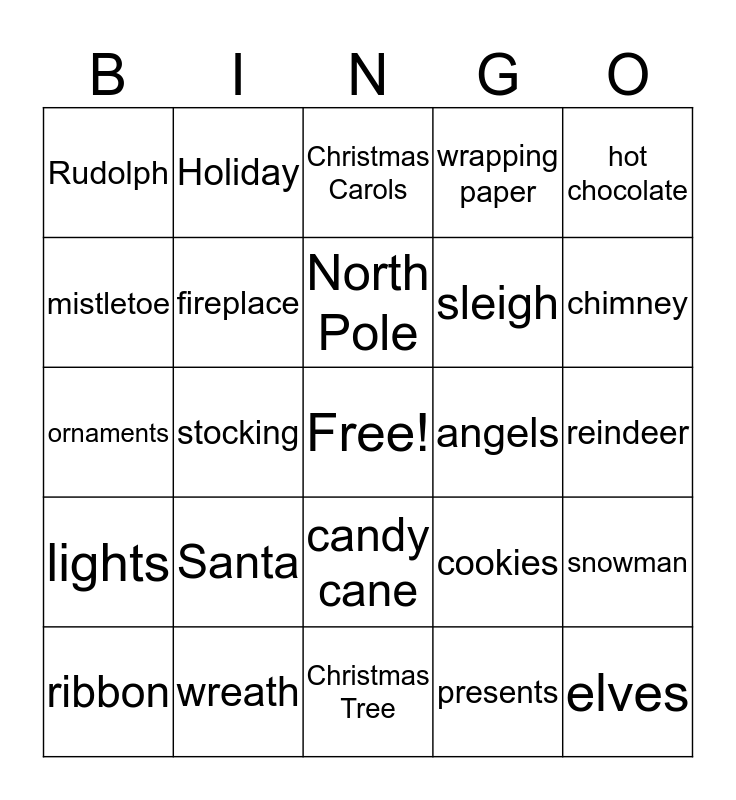 This bingo card has a free space and 24 words: Santa, wreath, North Pole, ribbon, hot chocolate, Rudolph, mistletoe, Holiday, angels, candy cane, sleigh, ornaments, cookies, snowman, fireplace, presents, reindeer, Christmas Carols, chimney, stocking, elves, lights, wrapping paper and Christmas Tree.