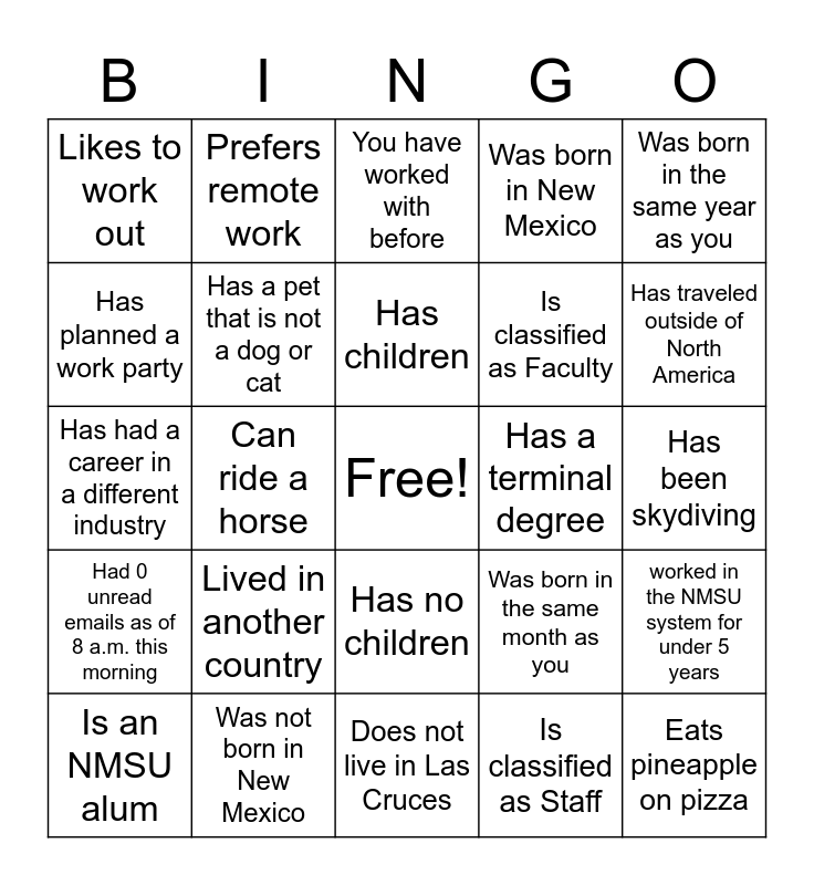 This bingo card has a free space and 28 words: worked in the NMSU system for under 5 years, worked in the NMSU system for over 15 years, Is classified as Faculty, Is classified as Staff, Has planned a work party, You have worked with before, Prefers remote work, Had 0 unread emails as of 8 a.m. this morning, Has a terminal degree, Is an NMSU alum, Has had a career in a different industry, Was born in New Mexico, Was not born in New Mexico, Does not live in Las Cruces, Has traveled outside of North America, Speaks another language, Lived in another country, Has a pet that is not a dog or cat, Has children, Has no children, Likes to work out, Plays video games, Eats pineapple on pizza, Can ride a horse, Has been skydiving, Was born in the same month as you, Was born in the same year as you and Has run a marathon.