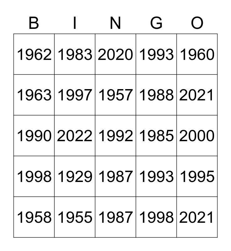 This bingo card has a free space and 24 words: 1929, 1955, 1957, 1958, 1960, 1962, 1963, 1983, 1985, 1987, 1988, 1990, 1993, 1995, 1997, 1998, 2000, 2020, 2021, 2022, 2021, 1998, 1993 and 1987.