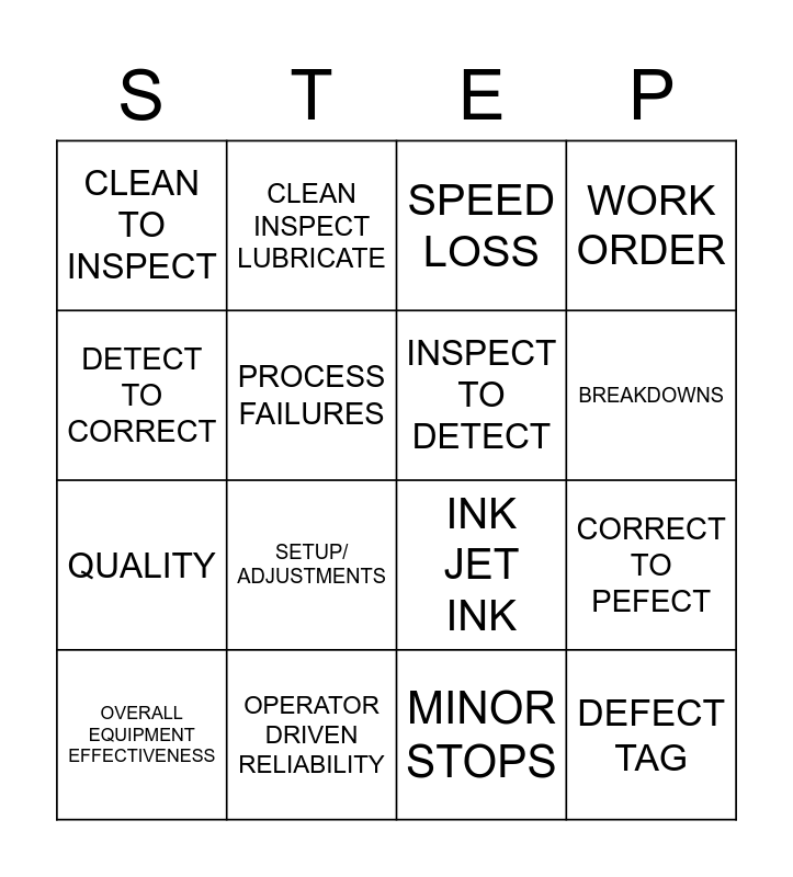 This bingo card has 16 words: OPERATOR DRIVEN RELIABILITY, CORRECT TO PEFECT, SPEED LOSS, CLEAN TO INSPECT, QUALITY, CLEAN INSPECT LUBRICATE, INK JET INK, MINOR STOPS, DETECT TO CORRECT, PROCESS FAILURES, OVERALL EQUIPMENT EFFECTIVENESS, WORK ORDER, SETUP/ ADJUSTMENTS, BREAKDOWNS, INSPECT TO DETECT and DEFECT TAG.