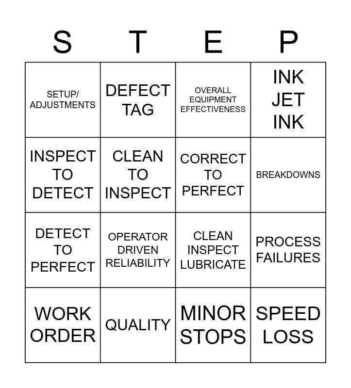 This bingo card has 16 words: QUALITY, PROCESS FAILURES, OVERALL EQUIPMENT EFFECTIVENESS, SETUP/ ADJUSTMENTS, DETECT TO PERFECT, DEFECT TAG, CLEAN INSPECT LUBRICATE, MINOR STOPS, INSPECT TO DETECT, CLEAN TO INSPECT, WORK ORDER, INK JET INK, OPERATOR DRIVEN RELIABILITY, BREAKDOWNS, CORRECT TO PERFECT and SPEED LOSS.