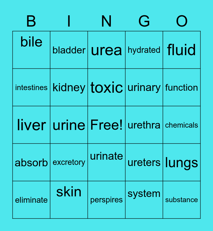 This bingo card has a free space and 24 words: excretory, skin, toxic, eliminate, fluid, bile, intestines, bladder, urethra, urinate, urinary, liver, ureters, lungs, kidney, system, chemicals, urea, function, urine, substance, absorb, hydrated and perspires.