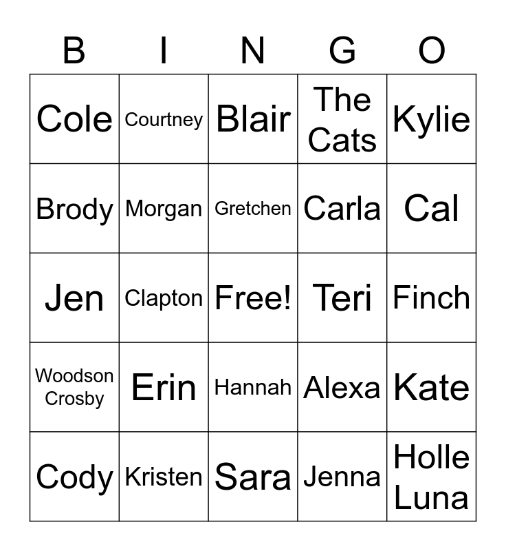 This bingo card has a free space and 24 words: Erin, Kristen, Gretchen, Cody, Kylie, Cole, Brody, Courtney, Teri, Hannah, Carla, Jen, Alexa, Kate, Morgan, Jenna, Finch, Blair, Cal, Clapton, Holle Luna, Woodson Crosby, The Cats and Sara.