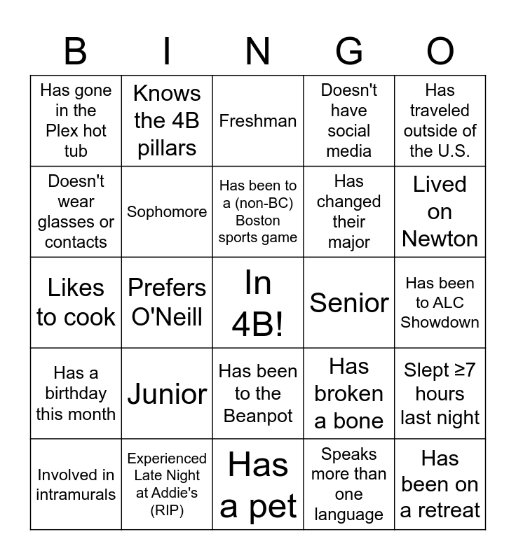 This bingo card has a free space and 29 words: Involved in intramurals, Prefers Bapst, Prefers O'Neill, Has to fly to get to BC, Has gone in the Plex hot tub, Freshman, Sophomore, Junior, Senior, Experienced Late Night at Addie's (RIP), Has been to ALC Showdown, Has been on a retreat, Has a pet, Speaks more than one language, Lived on Newton, Lived on Upper, Has been to the Beanpot, Has a birthday this month, Has traveled outside of the U.S., Likes to cook, Has broken a bone, Has a tattoo, Has changed their major, Doesn't wear glasses or contacts, Doesn't have social media, Knows the 4B pillars, Slept ≥7 hours last night, Has been to a (non-BC) Boston sports game and Can play a musical instrument.