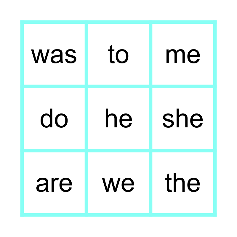 This bingo card has 12 words: I, the, he, she, to, me, we, be, was, do, are and all.